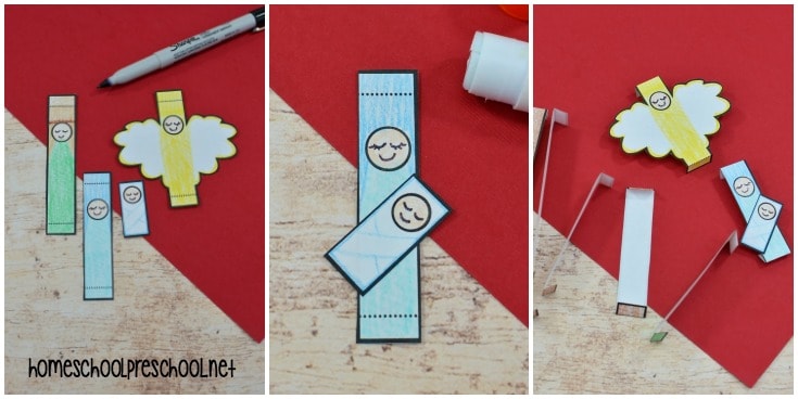 Color the strips on the other templates. The first four rectangles will be used to make the manger. The other strips will be Joseph, Mary, Jesus, and an angel. You can add cute faces if you wish.