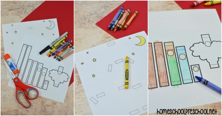 You don’t need much to get started with this craft. Just a printer, glue, and something to color with. Cutting out the strips is a great fine motor activity that will help little ones build the muscles in their hands.