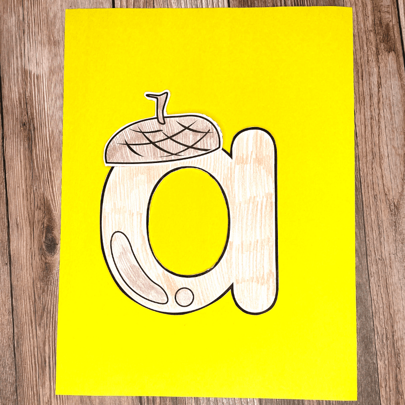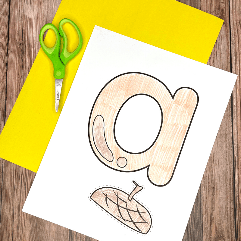 Now, cut out all of the pieces. Glue the acorn cap to the top side of the letter “a”.