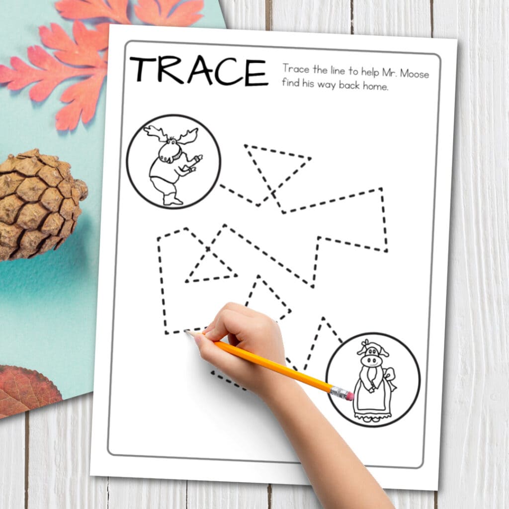 Mr. Moose needs help finding his way back home! This pre-writing page encourages children to follow the path using their finger or a pencil, building fine motor strength and visual tracking skills along the way.