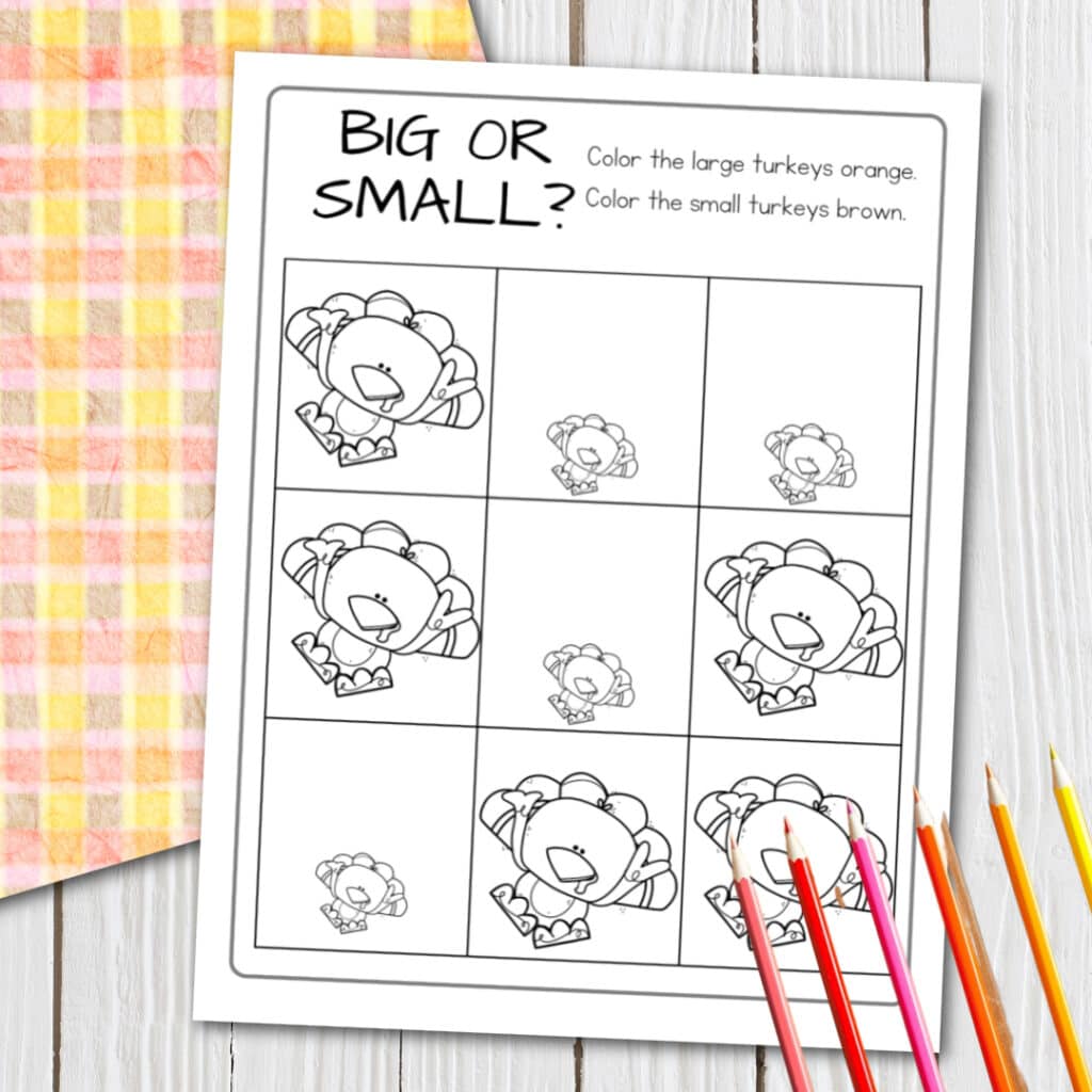 In this simple sorting activity, preschoolers color large turkeys orange and small turkeys brown. It’s an engaging way to introduce size comparison, color recognition, and listening skills—perfect for your Thanksgiving math or fine motor centers.
