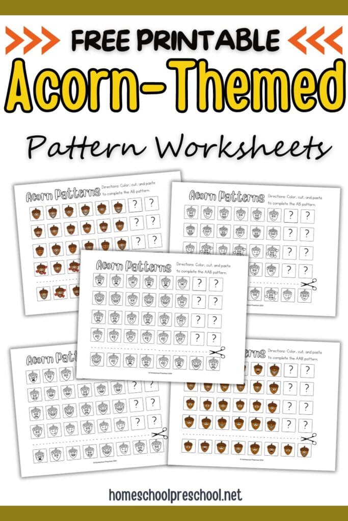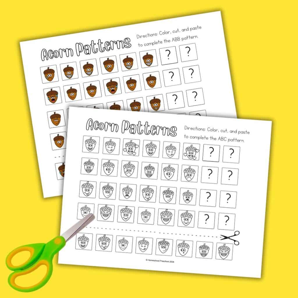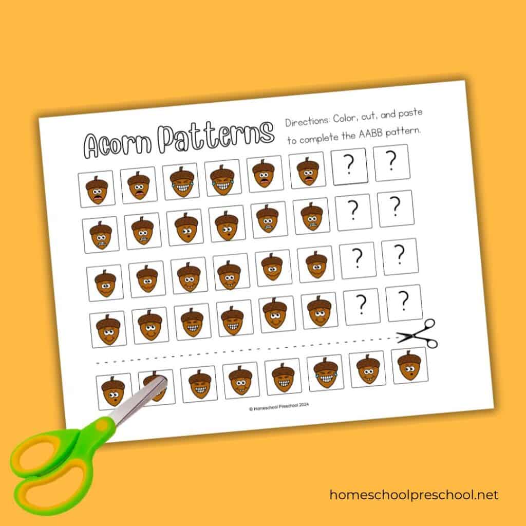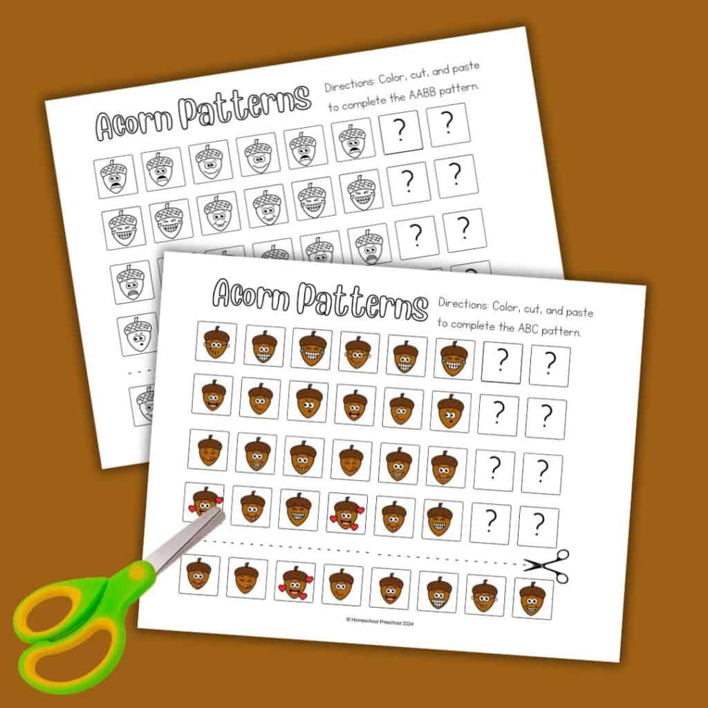 Looking for a fun way to teach patterns this fall? Our acorn pattern printables are perfect for preschoolers to practice identifying and completing patterns. These preschool pattern worksheets encourage children to identify the pattern in each row and cut and paste images to finish the patterns.
