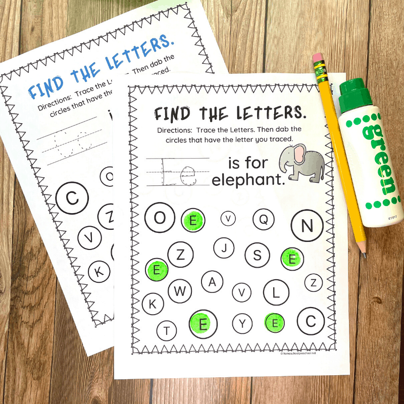 Then, have kids use a bingo dauber/dot marker to identify the featured letters. They’ll strengthen fine motor skills gripping the dot marker. Strengthen visual discrimination skills as they search among the letters to find the featured ones.