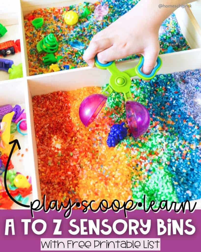 Before you dive into the A–Z list, it helps to have a few basics in place. Start with a container that’s shallow and wide—dish tubs, plastic bins, or even large baking trays all work well. Then choose a filler: rice, beans, oats, water beads, shredded paper, or sand are all popular options. Add in tools like scoops, cups, tweezers, or tongs to give kids new ways to explore and build fine motor skills.