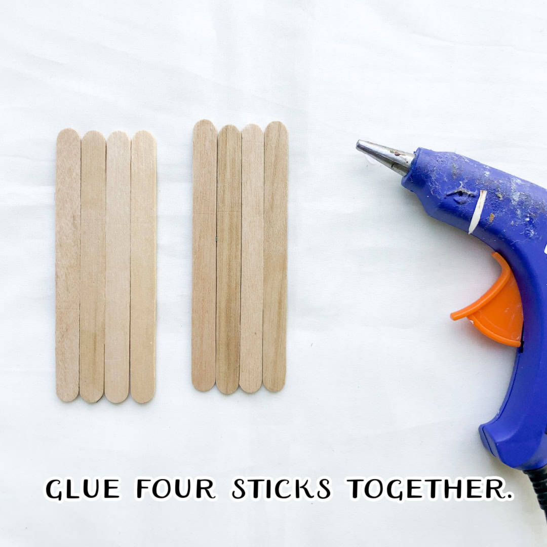 Step three: Glue four (4) popsicle sticks together. You can glue them together on their sides, or you can glue four sticks vertically to a stick turned horizontally. The horizontal stick will act as a brace for the vertical sticks.