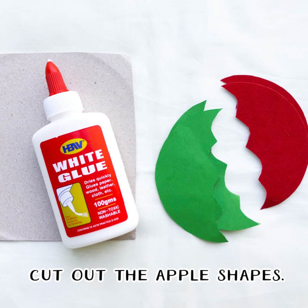 Step one: To get started, gather all of your supplies beforehand. Just a note… instead of painting apple seeds on, your preschoolers might enjoy glueing real apple seeds to the apple before hanging it on the fridge.