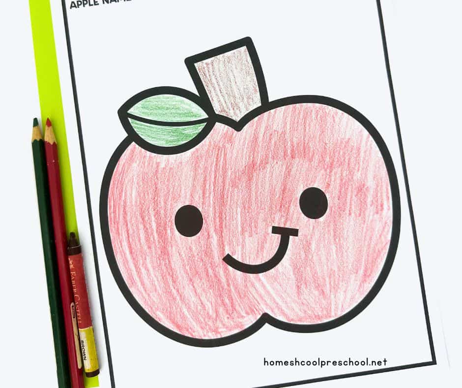 Instruct your child to color the apple, stem, and leaf. If they’d like, they can cut out the apple shape, keeping the stem and leaf intact.