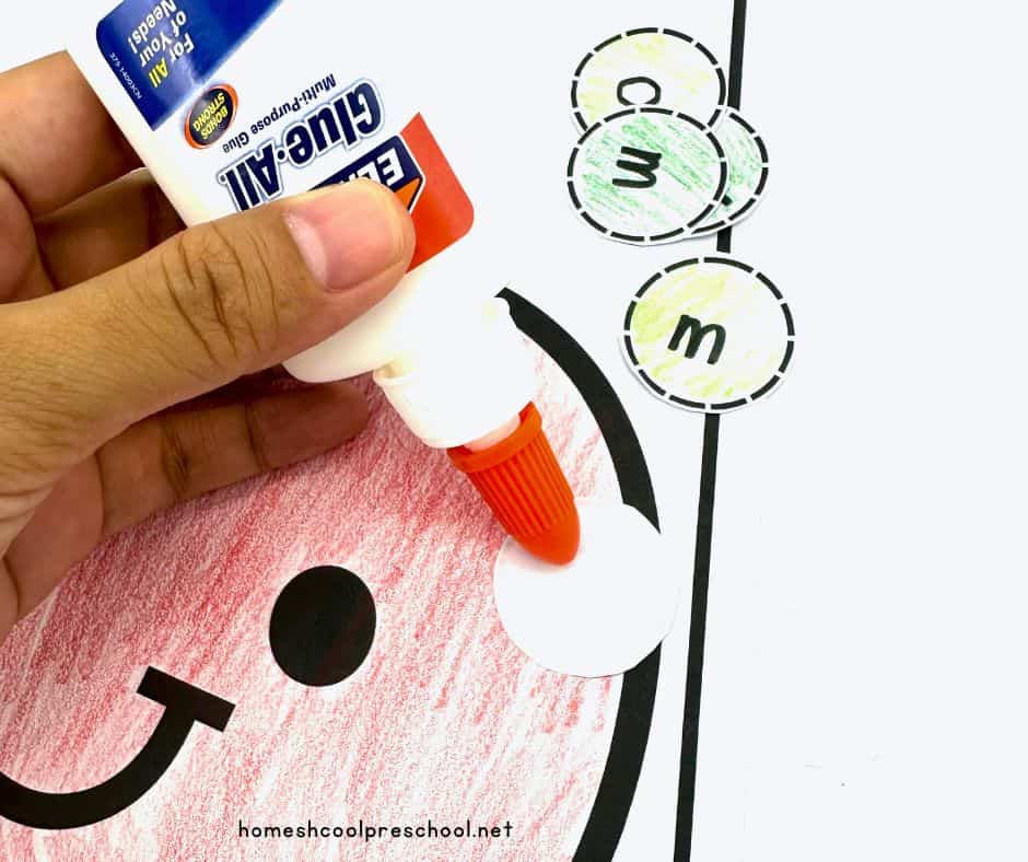 Have your child glue the letter circles onto the top of the apple to spell their name. Before they glue them down, make sure the letters are in the correct order.