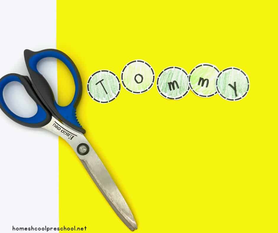 Use safety scissors to cut out the circles from the circle template. Be sure you have one circle for each letter of the child’s name.