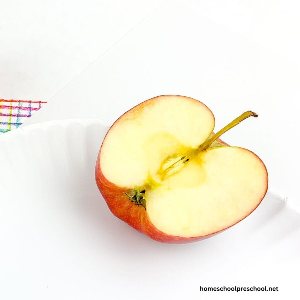 Start by cutting an apple in half (grown-ups only for this part!). If possible, leave the stem on—it provides kids with a fun handle to grip. Use a paper towel to blot the cut side and remove any extra juice.