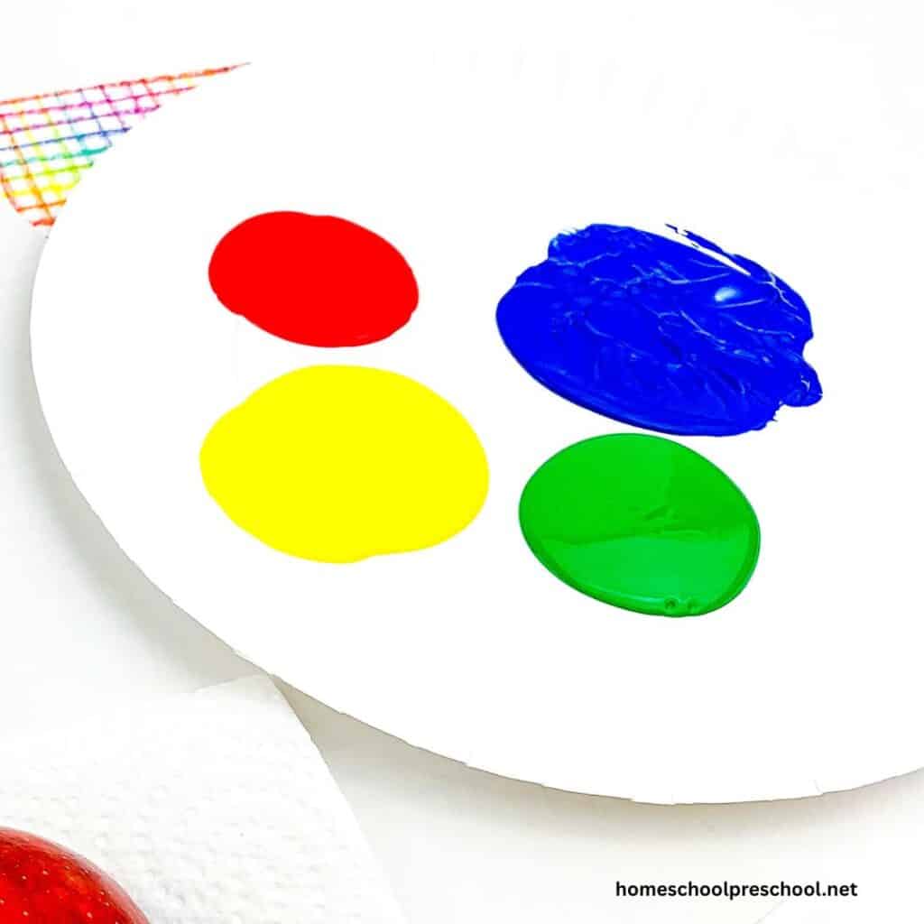 To change colors, blot the apple on a paper towel to wipe off extra paint before dipping into a new color.