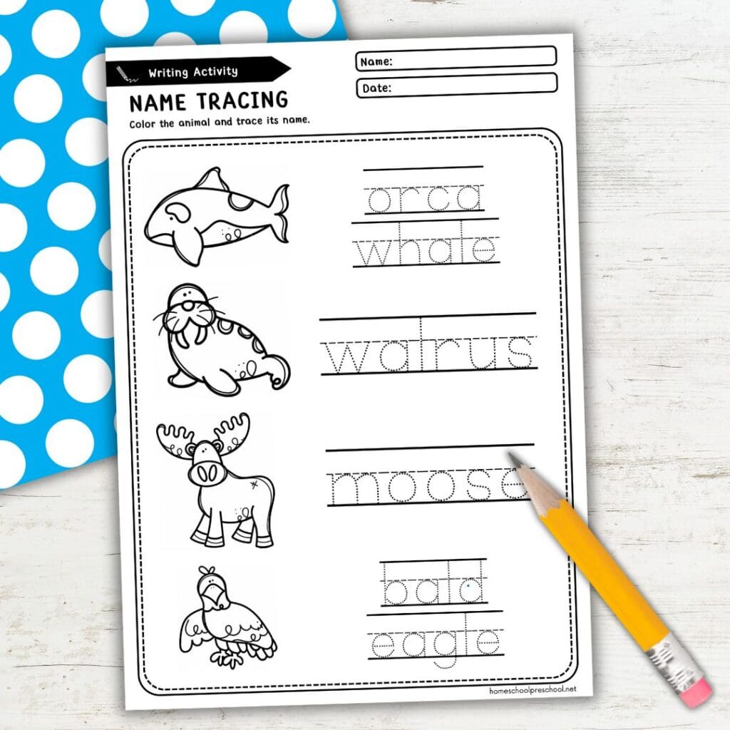 - Name Tracing Sheets: Practice writing skills while tracing the names of animals like orcas, moose, and walruses.