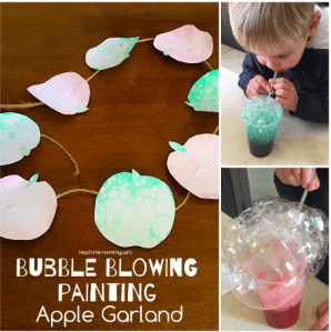 When I was student teaching (a million years ago), I did bubble blowing painting with my littles. It’s a fun way to explore paint prints. Try it with your preschoolers, and turn their artwork into an apple garland. Teach Me Mommy