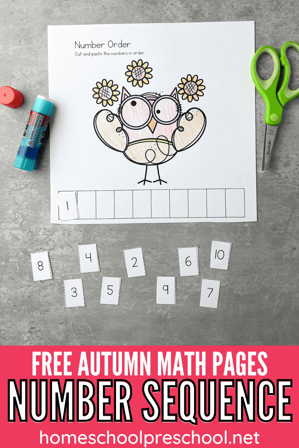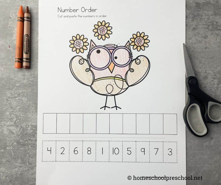 At the bottom of the page, kids will cut out the numbers 1-10. They’re all mixed up. Your child’s job is to put those numbers in the correct order and glue them in a row.