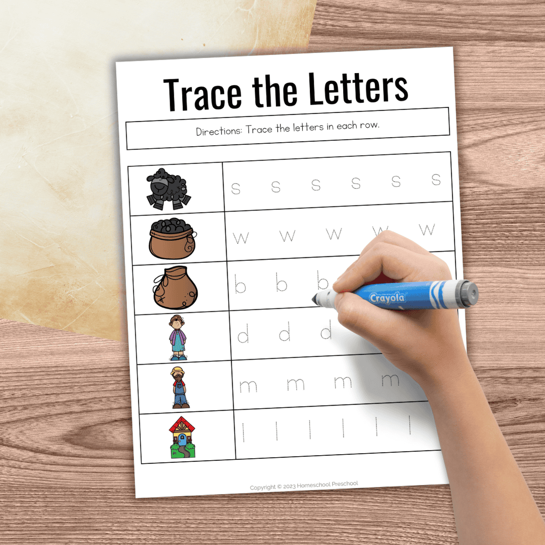 The “Trace the Letters” page includes six letters to trace. Each row contains a picture from the rhyme and its beginning letter. Children will name the object and trace the letters.
