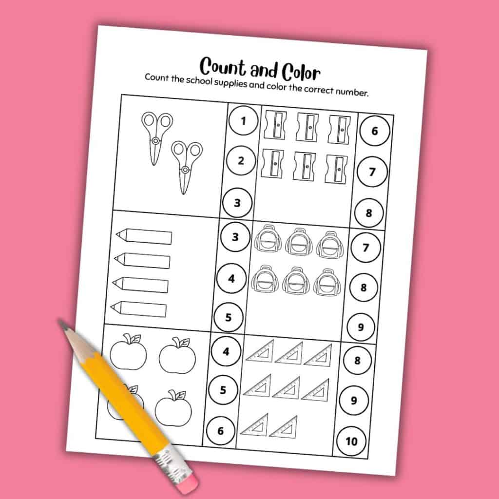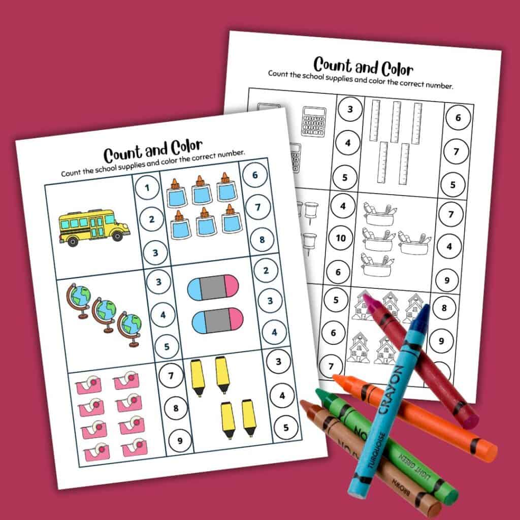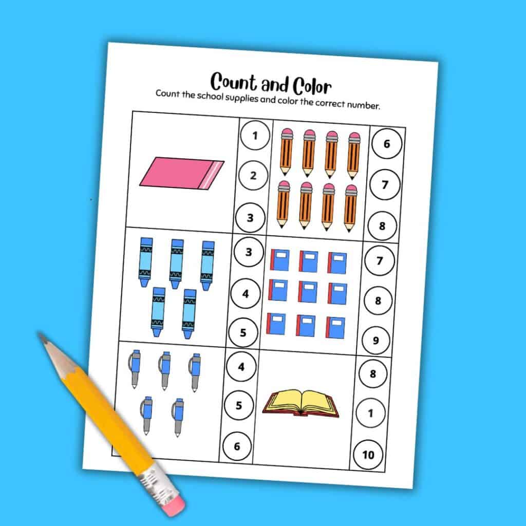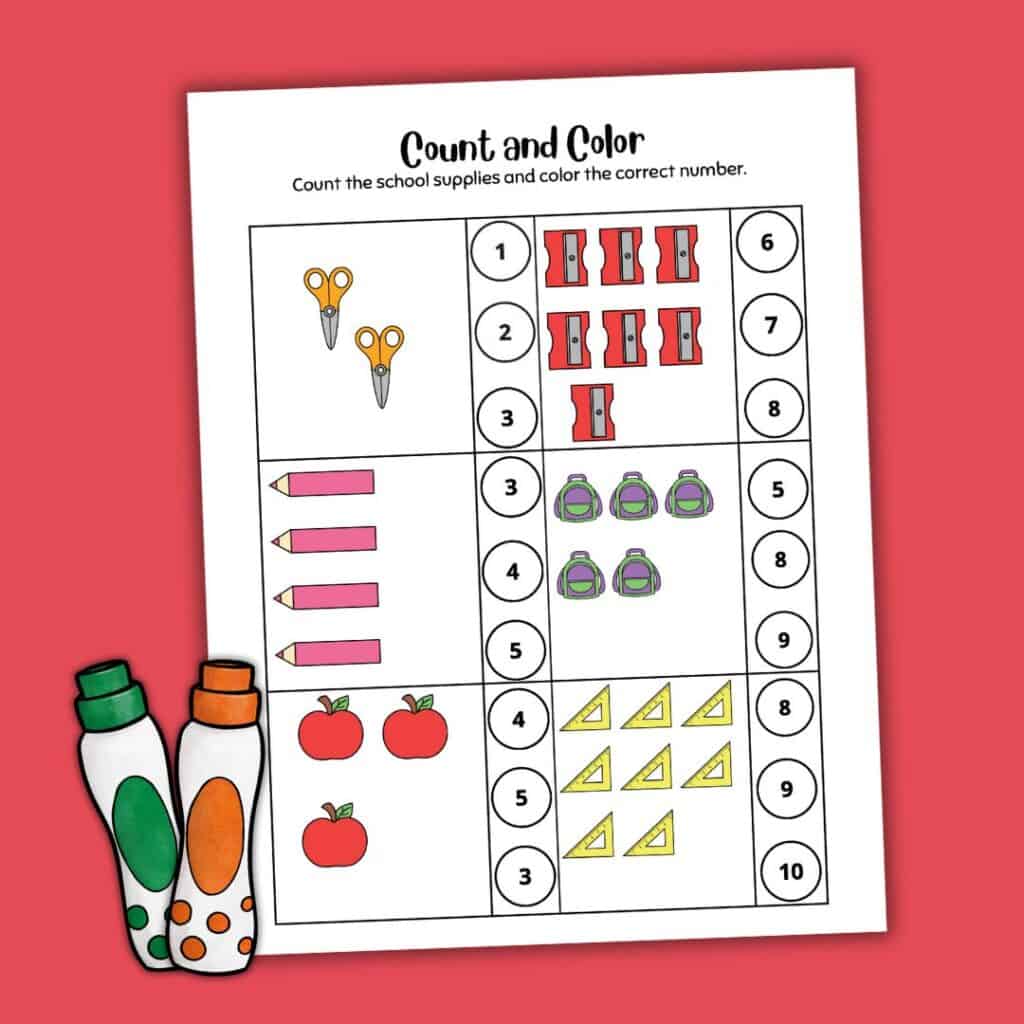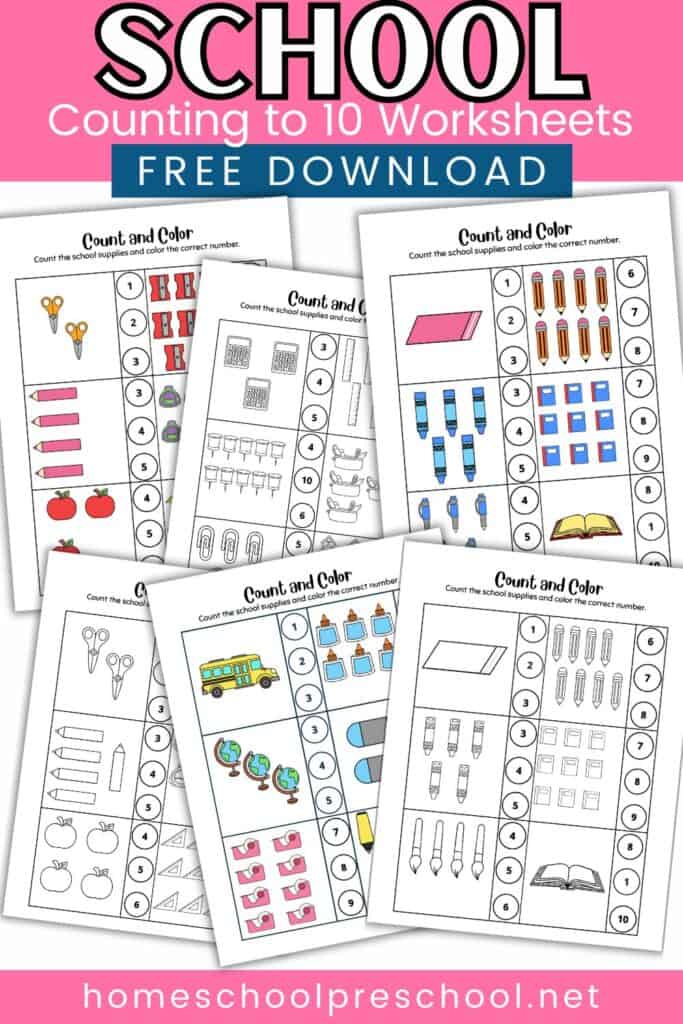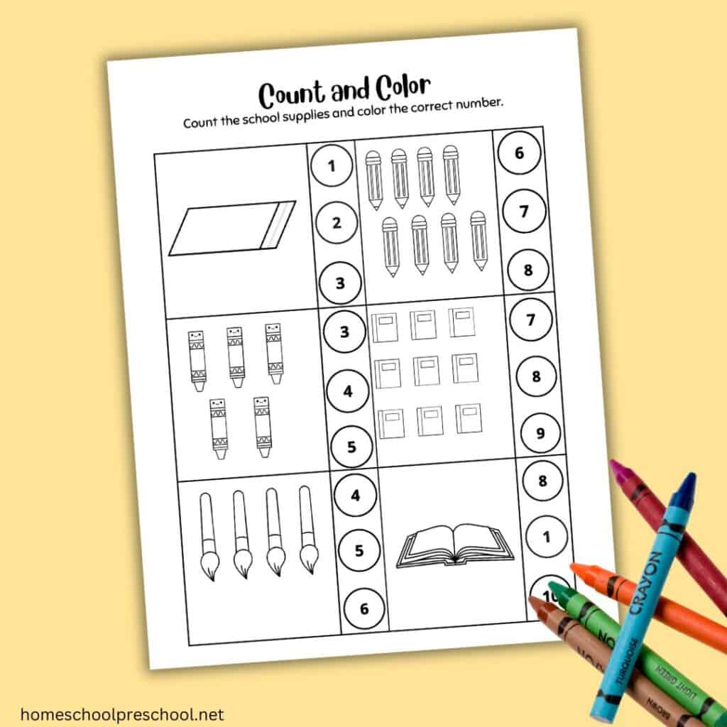 Print out the worksheets and gather some crayons or markers. Begin by showing your child the worksheet and pointing out the different school-themed items to be counted. Encourage your child to count each item aloud, helping them point to each one as they go.