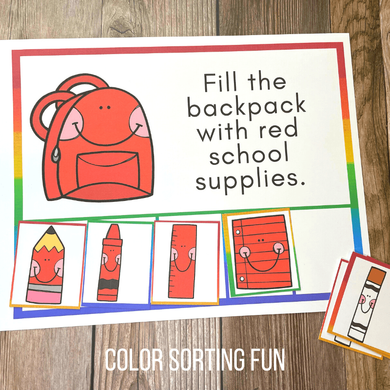 Now, have children identify the color of each backpack. Then, have them sort the school supplies onto the correct mats.