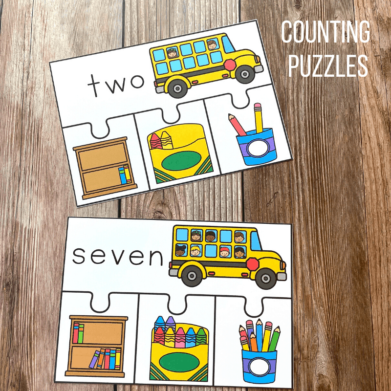 Then, count the school supplies and assemble the puzzles to match all of the pieces with the same numbered sets.
