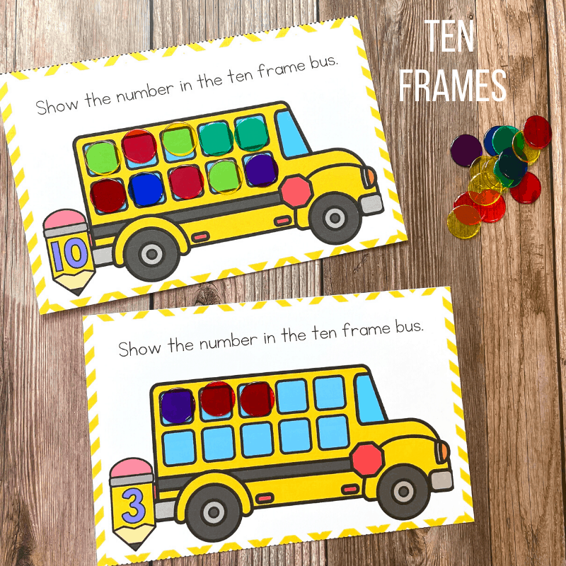 Spread the puzzle tops out, and the spread out the supply pieces. Have children choose a top to work with. Identify the number word and count the children on the bus.