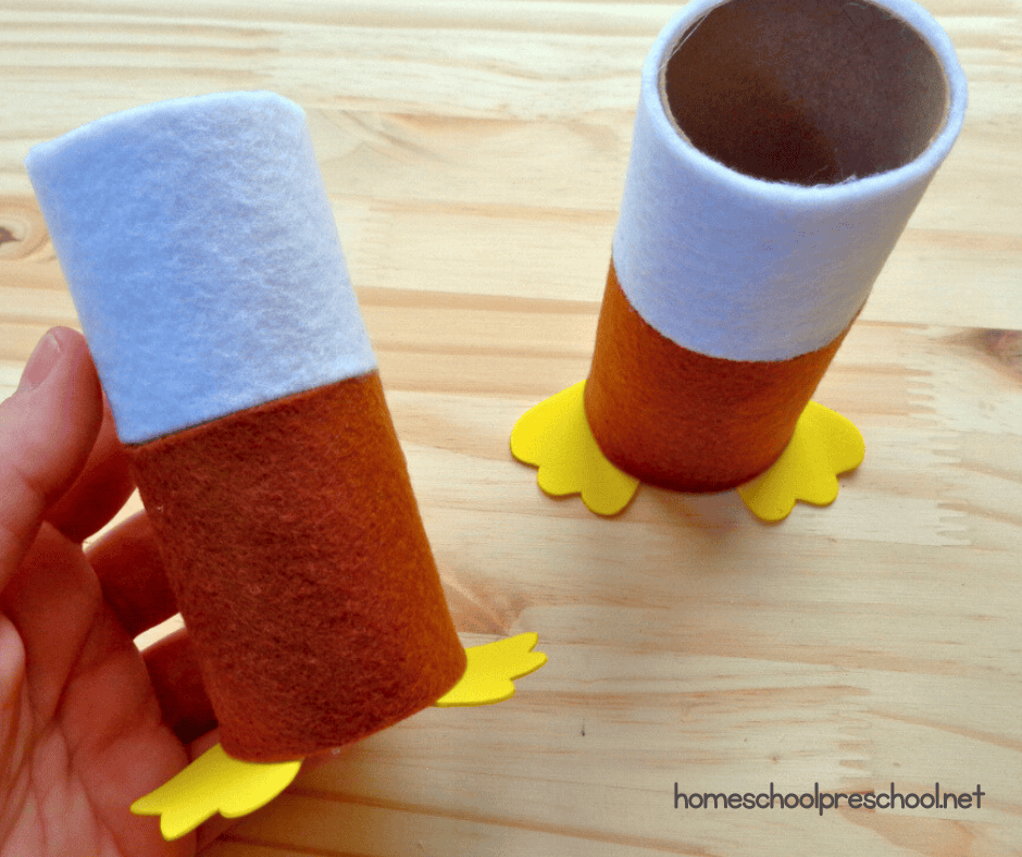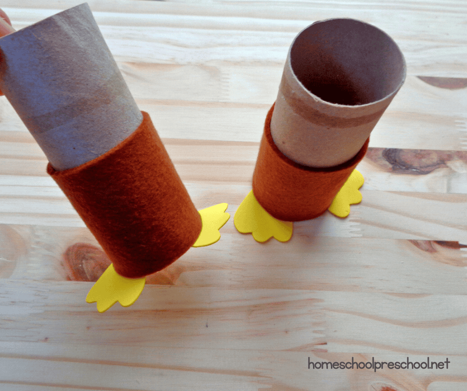 Cut a long strip of brown paper a little more than half the height of your toilet paper tube. Wrap the felt around the bottom of your toilet paper tube and secure with glue on the back.