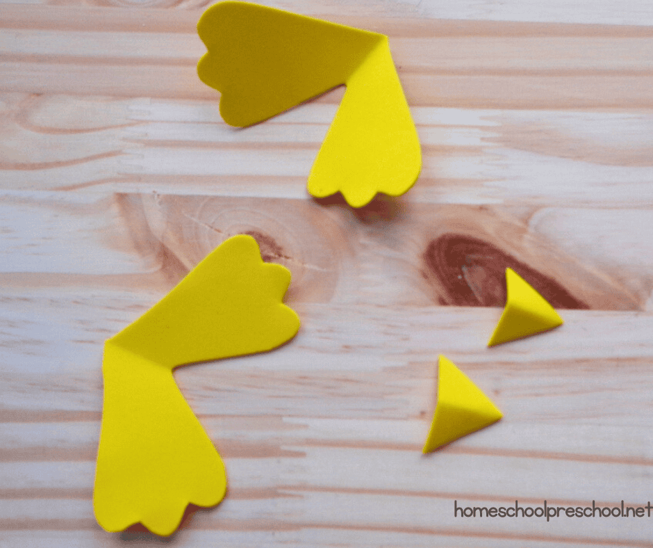 To begin, fold your yellow paper in half. On the fold, cut out the shape of bird feet. Use the scraps to create small triangle beaks.