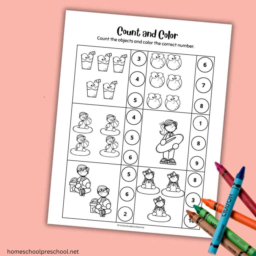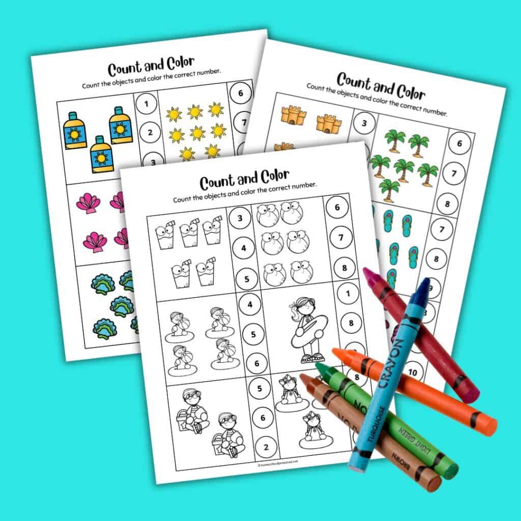 Once the counting is complete, it’s coloring time! Each worksheet has numbers displayed alongside the beach objects. Have your child find the matching number for each quantity they counted and color it in.