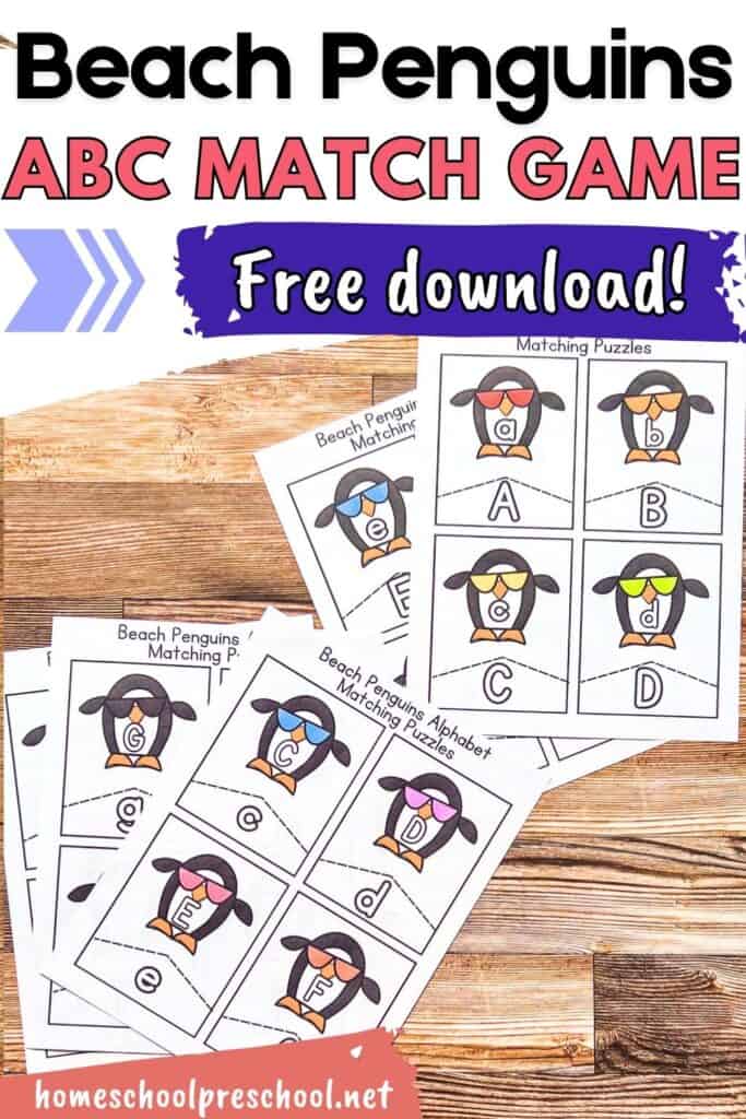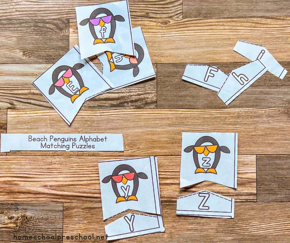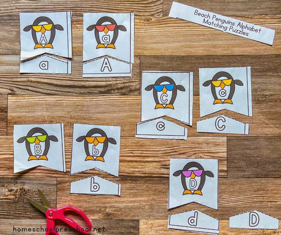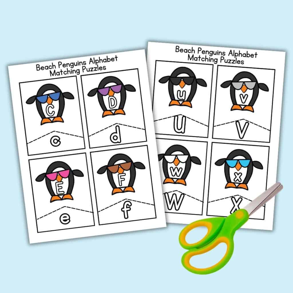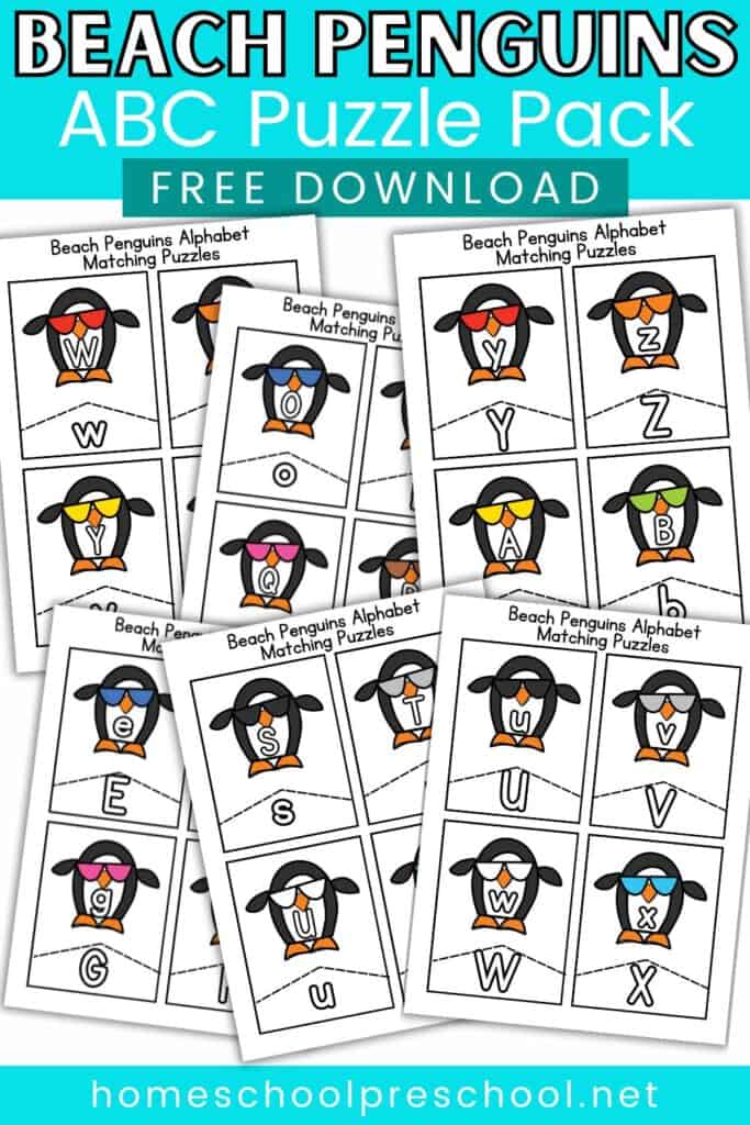 We’ve created a set of free preschool printables that you can easily download and print. Each worksheet features a letter of the alphabet and a playful beach penguin illustration. Print them out and cut the pieces to create fun puzzles your preschoolers love. These activity pages can be laminated for durability and used repeatedly.