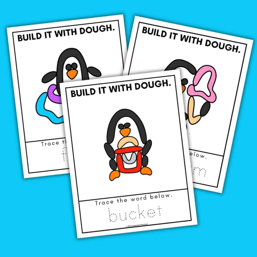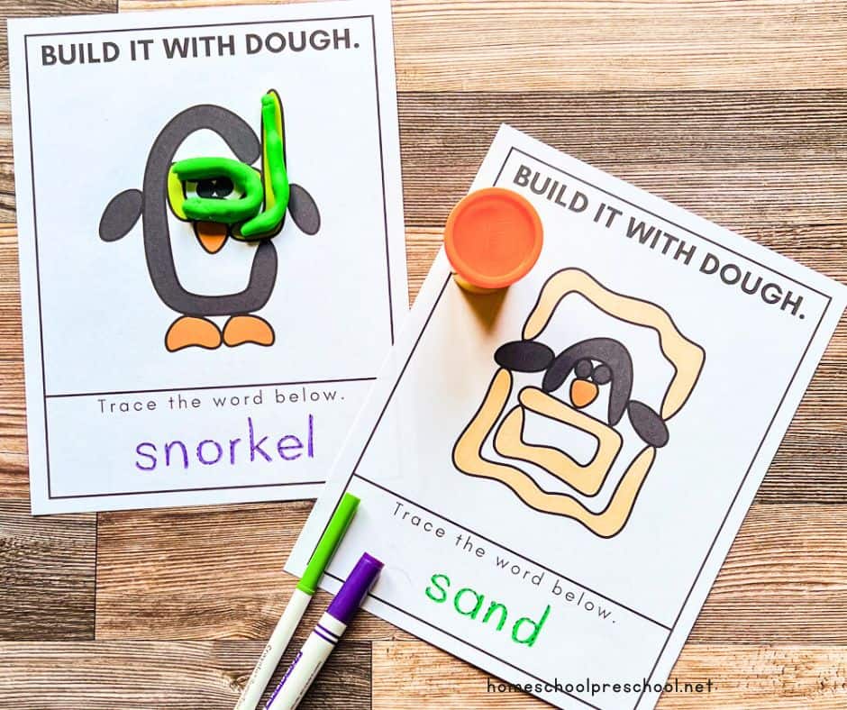 Begin by printing and laminating the playdough mats for durability. Provide different colors of playdough and shaping tools. Encourage your child to use the playdough to fill in the beach and penguin scenes on the mats.