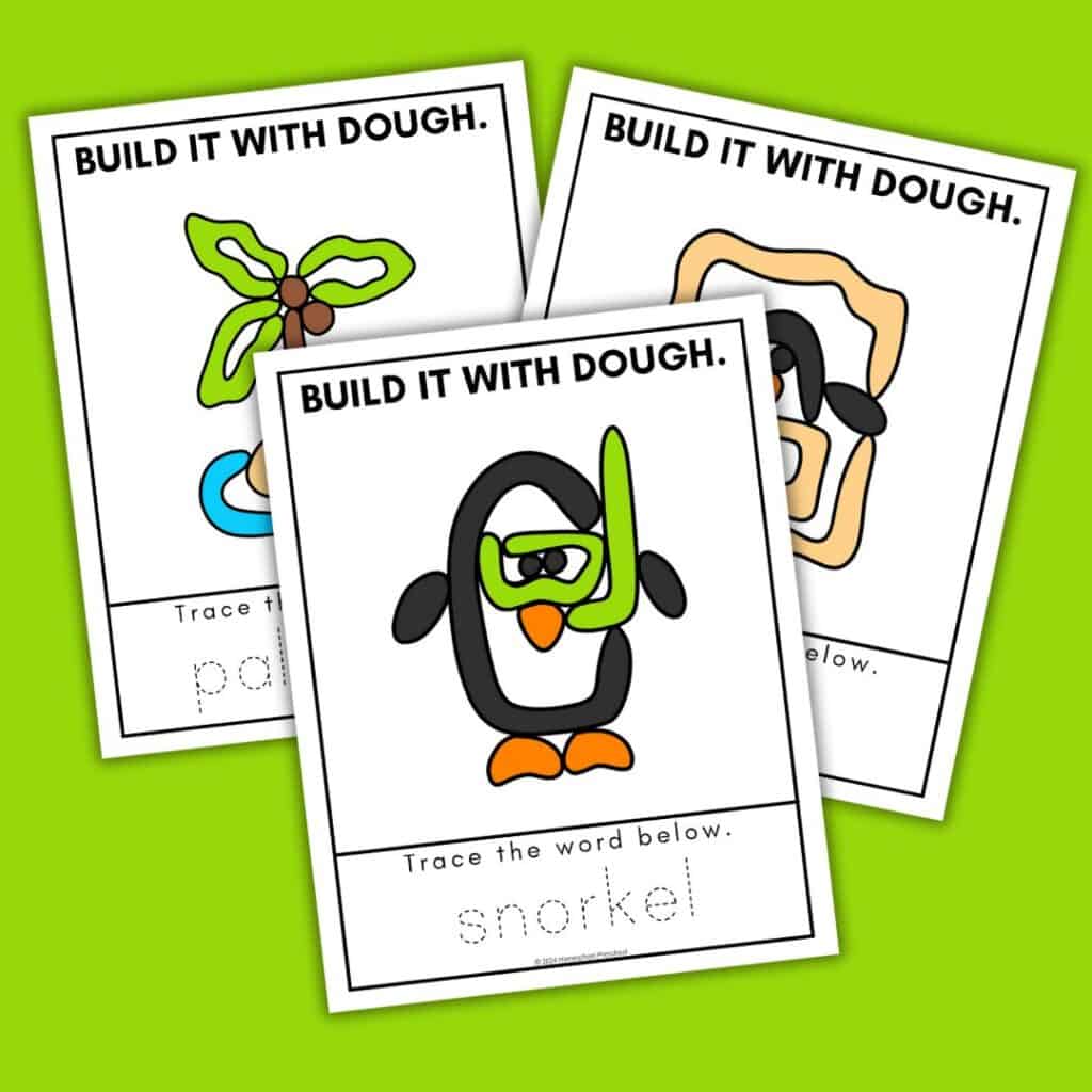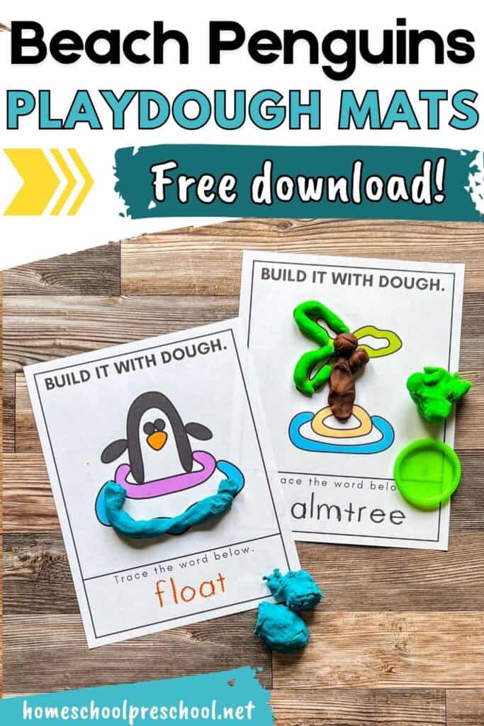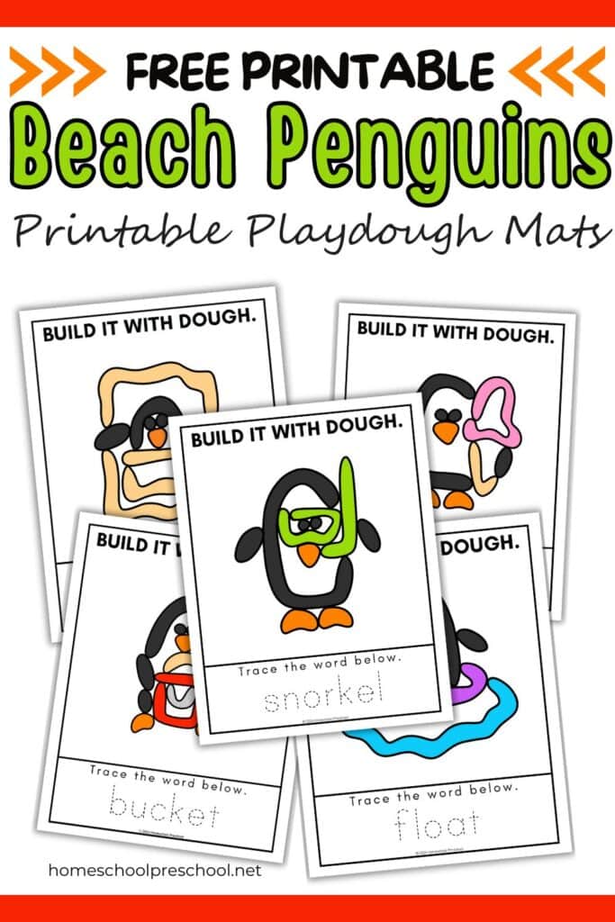 Our free printable playdough mats provide preschoolers with an interactive and hands-on learning experience. These mats feature cute penguin characters enjoying beach activities, inspiring children to use their imaginations while working with playdough.