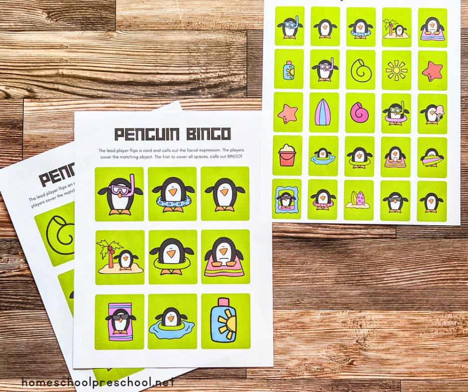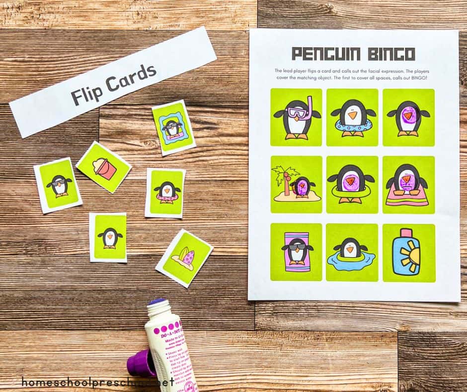 Start by printing out the preschool bingo with beach penguins theme cards and calling cards. Cut out the calling cards and place them in a bowl. Give each child a bingo card and some markers or chips to cover the items on their card.
