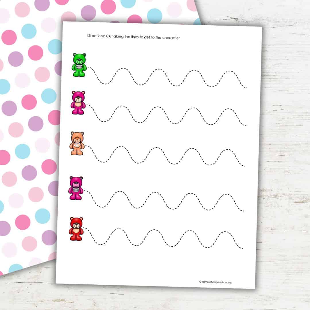 These preschool fine-motor worksheets provide children with a clear visual goal. They cut along dotted lines to “get to the bear” at the end of each path.
