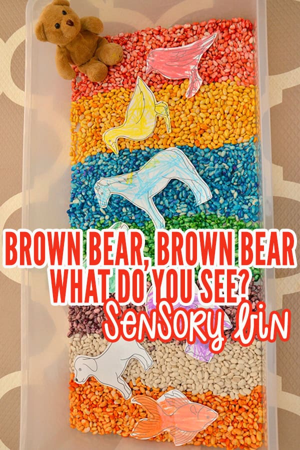 Bring the book to life with a fun Brown Bear-inspired colorful sensory bin. Fill it with colored beans and story characters, and let your kids explore.