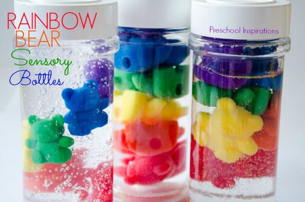 Discovery bottles are fun for kids. These rainbow counting bear discovery bottles use three sizes of rainbow counting bears to create three different styles of discovery bottles.