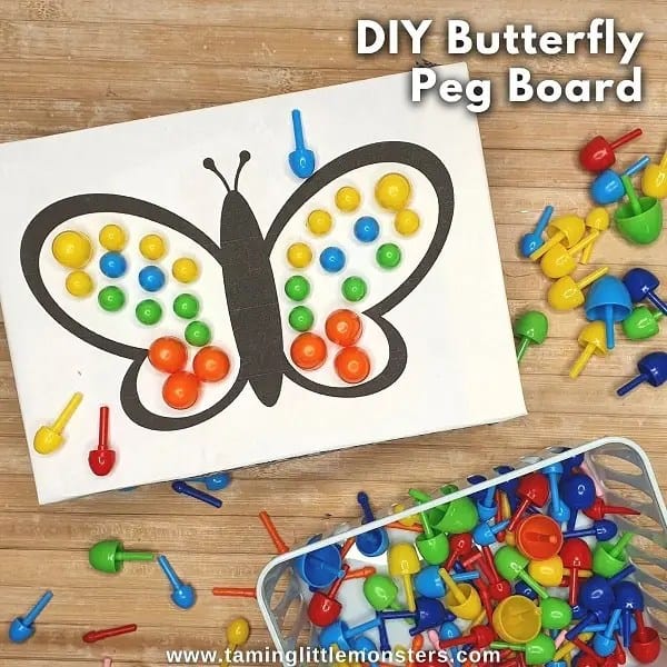 Get your little ones engaged in a fun and creative fine motor skills activity with this DIY Butterfly Peg Board. They'll have a blast firing their imagination while practicing hand-eye coordination by constructing colorful butterfly designs.