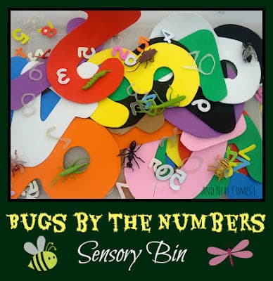 This activity was inspired by a book called Bugs by the Numbers by Sharon Werner and Sarah Fords. With some foam number stickers, large foam numbers, glue guns, and other supplies, you can easily make this bug-inspired sensory bin.