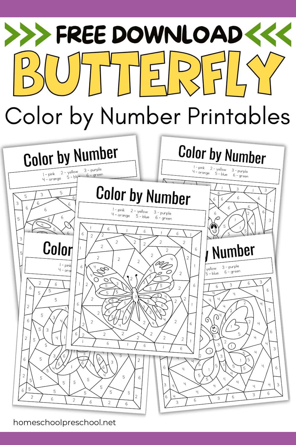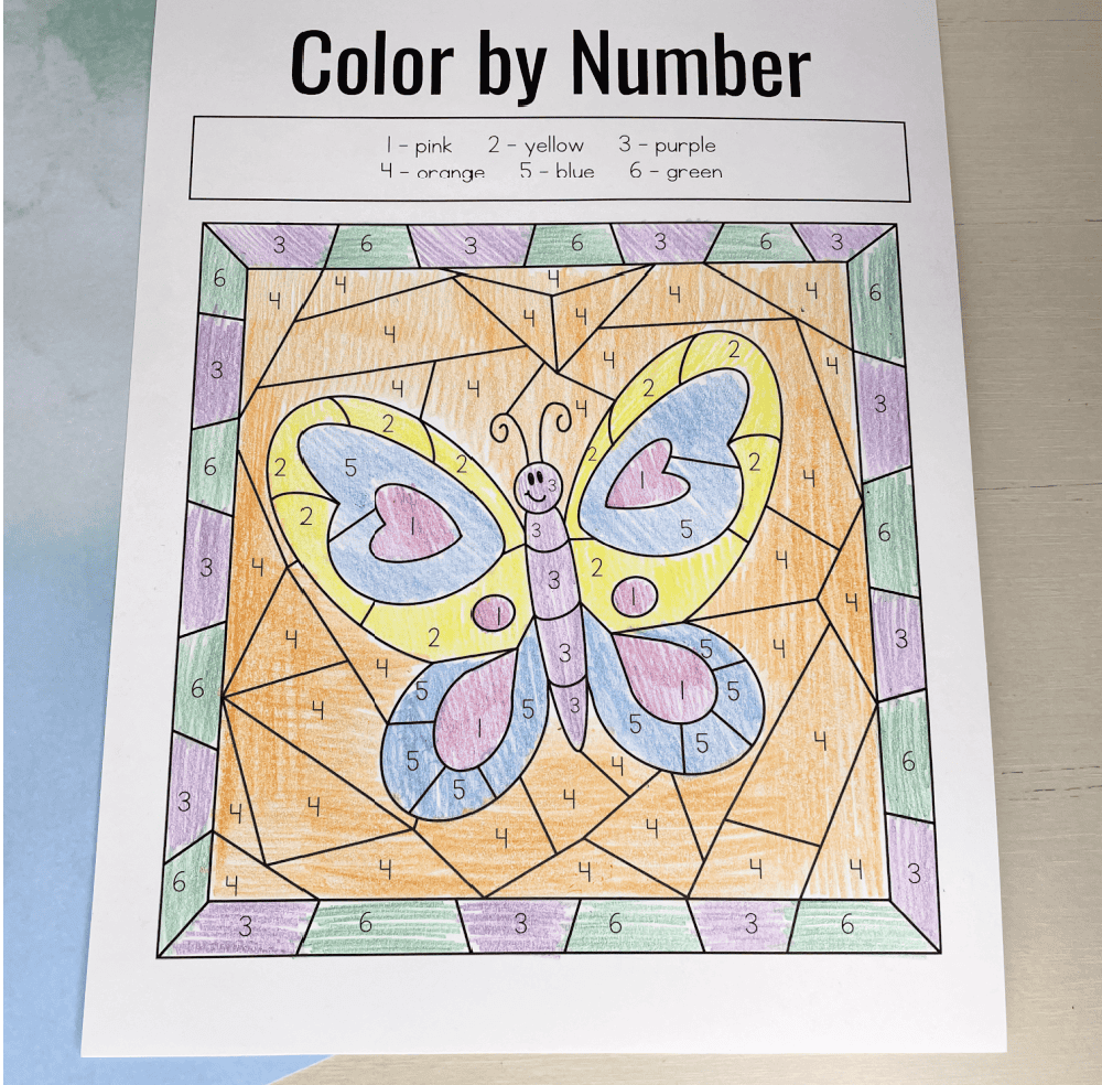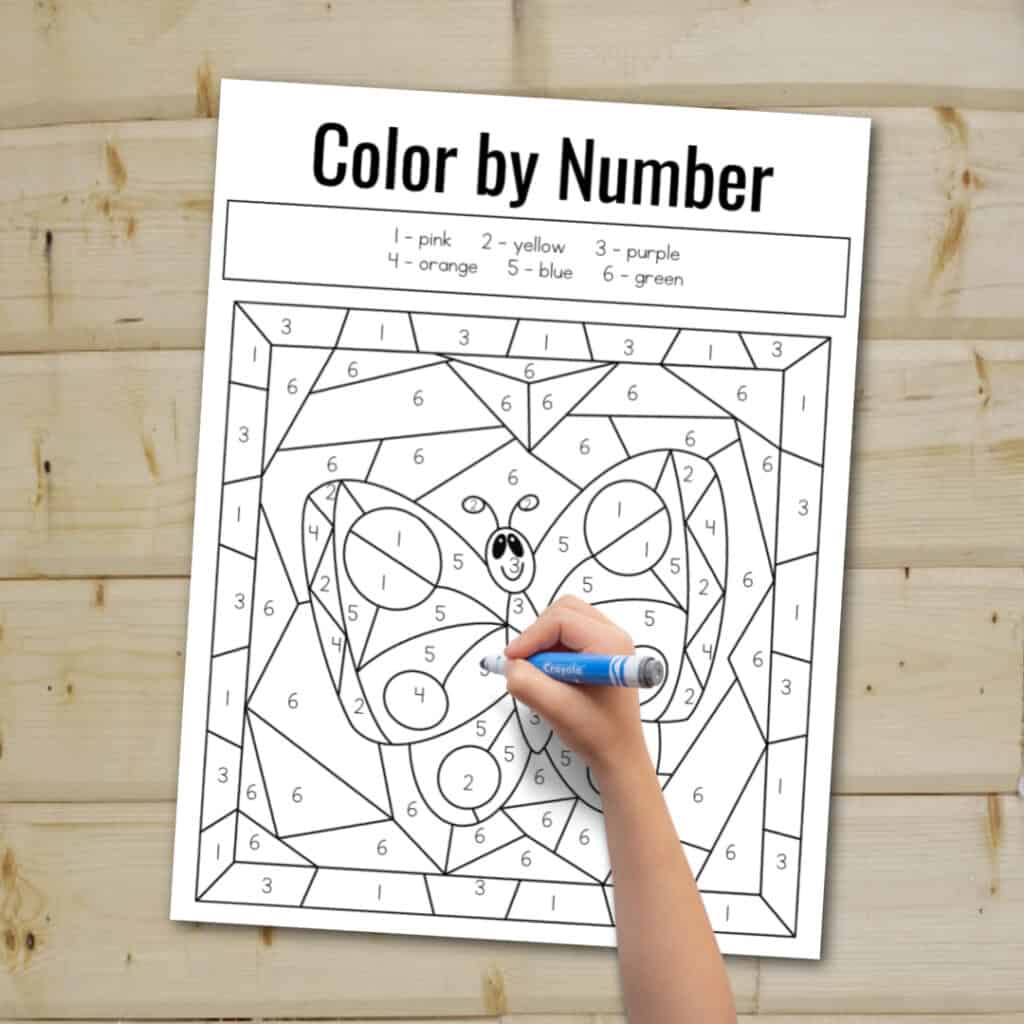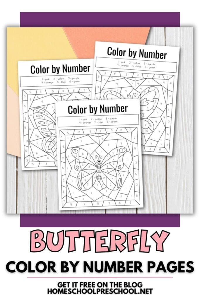 These color-by-number butterfly printables are a fun way for your children to have fun and learn about colors, numbers, color words, problem-solving skills, and more! These free preschool printables also allow kids to practice fine motor skills and hand-eye coordination.