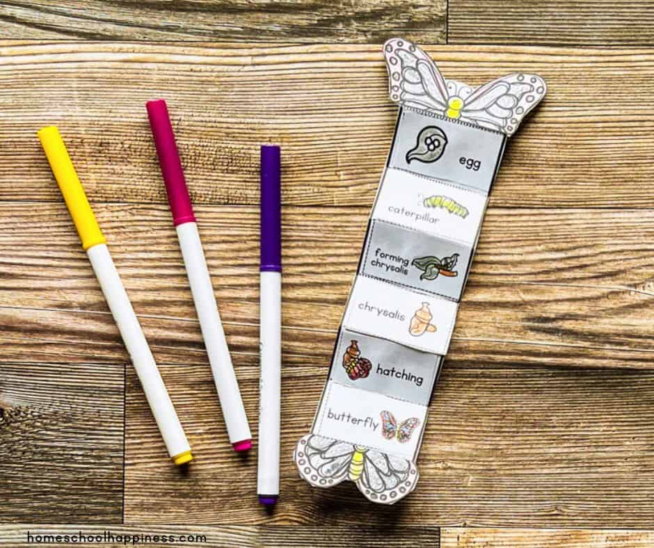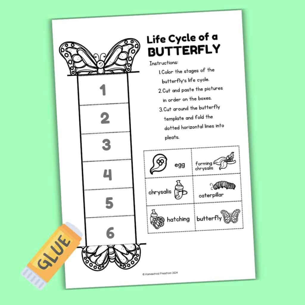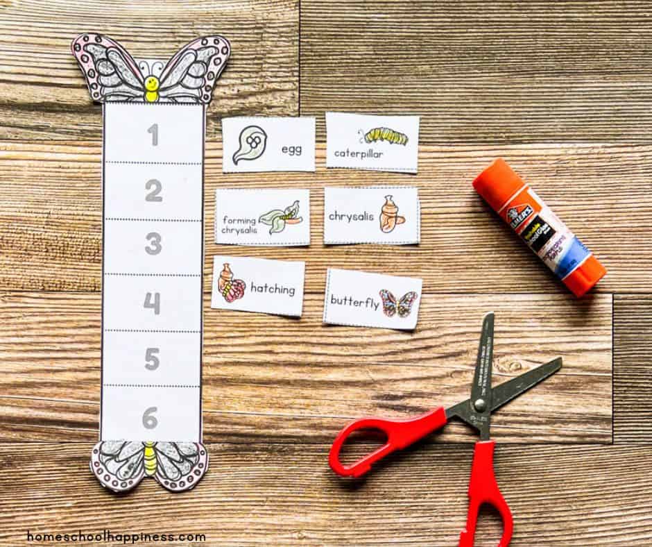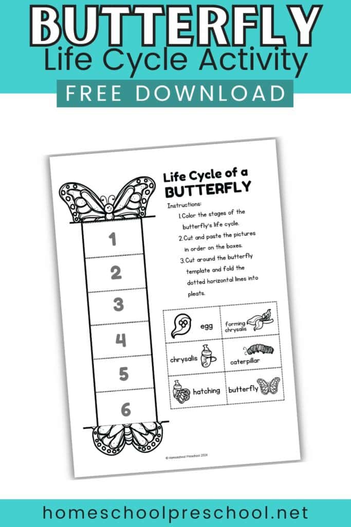 Start by downloading and printing the butterfly life cycle activity worksheets. Have your preschoolers color each stage of the butterfly’s life cycle. Next, guide them as they cut out the stages along the dotted lines.