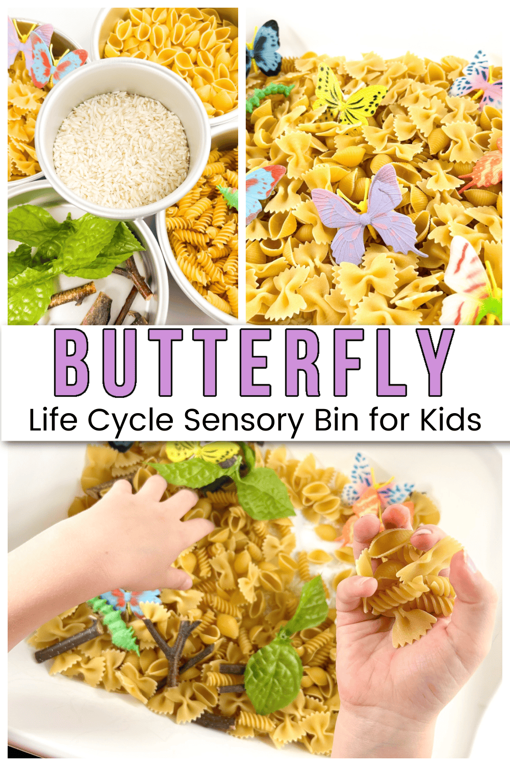 To prepare the butterfly sensory bin for your little ones, fill your bin with rice and pasta. The rice represents rice. The rotini represents caterpillars, the shells represent the chrysalis, and the bow ties represent butterflies.