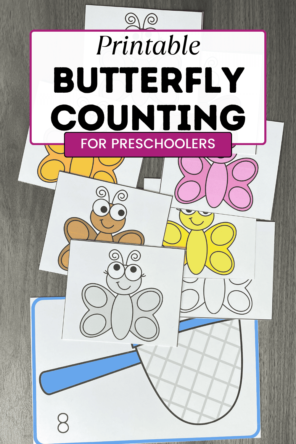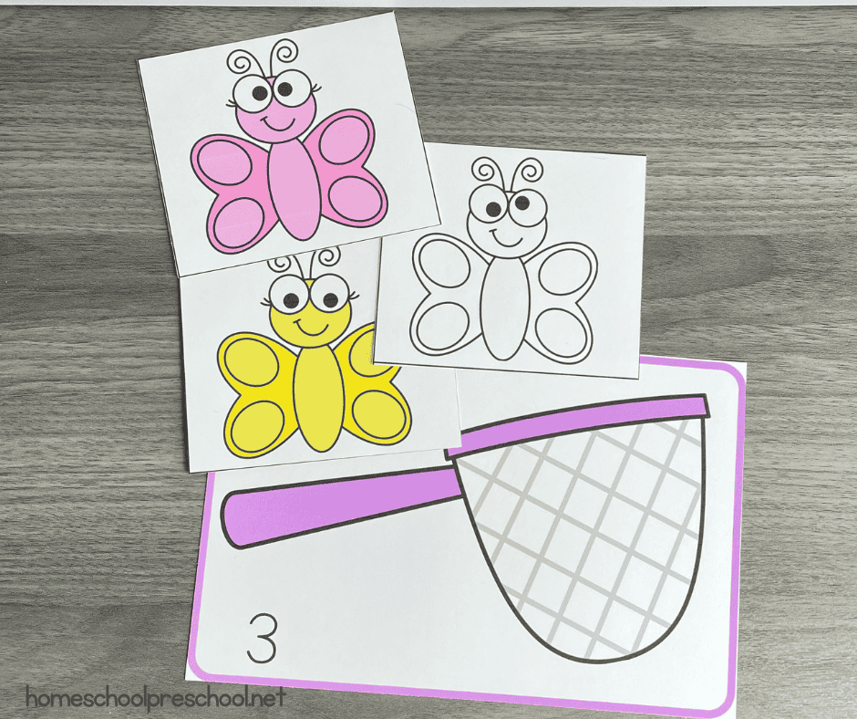 To begin, print out the cards with the numbered butterfly net and accompanying colorful butterflies.