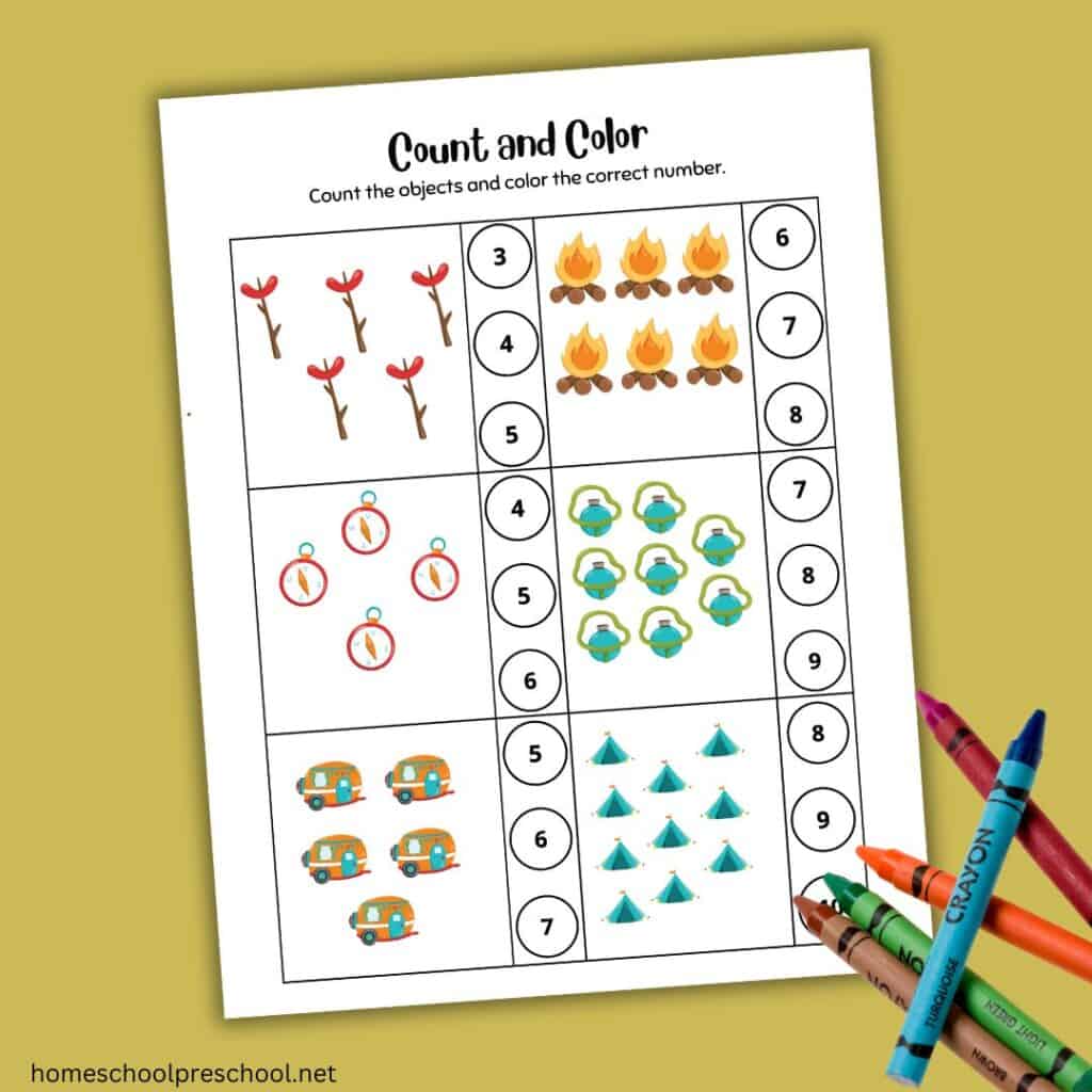 Once your little campers have finished counting each object, look for the numbers next to the set. These are their possible answers! Instruct them to color in the correct answer. Continue until they’ve completed the page.