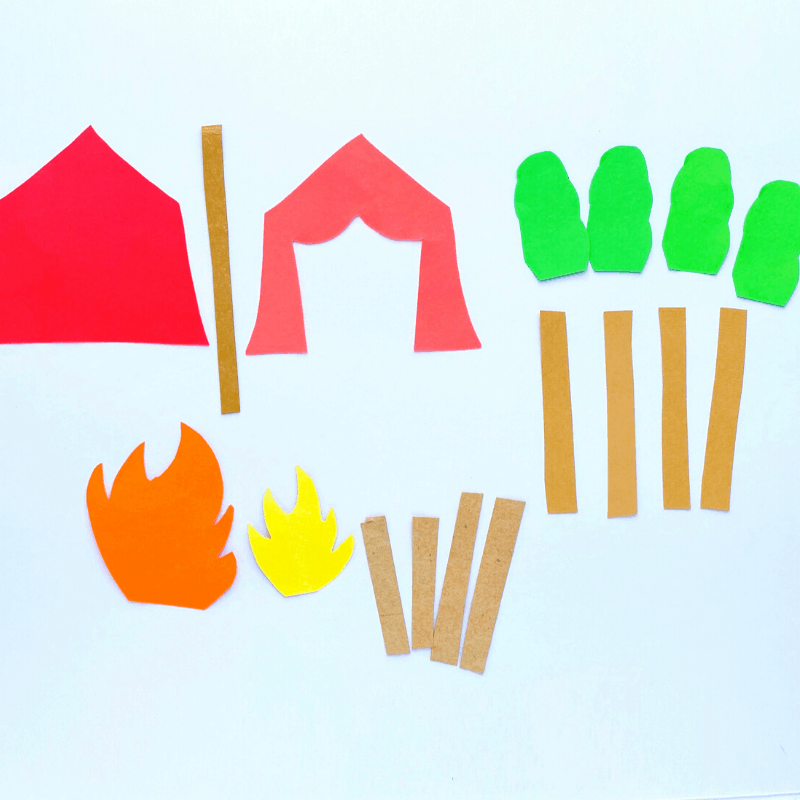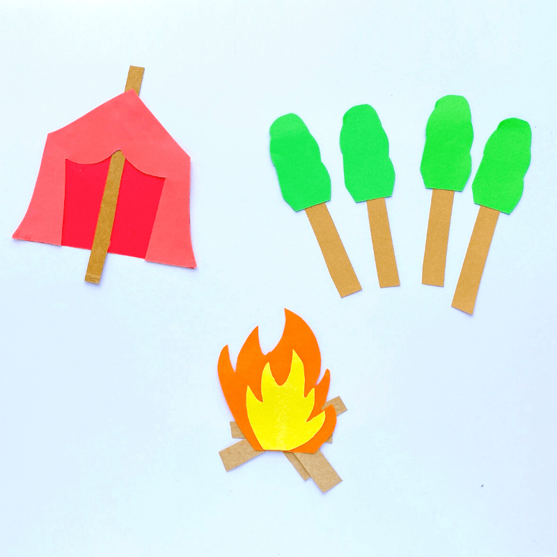 • Finish assembling the individual pieces by glueing the tent flaps to the front of the tent and the flames on the firewood.