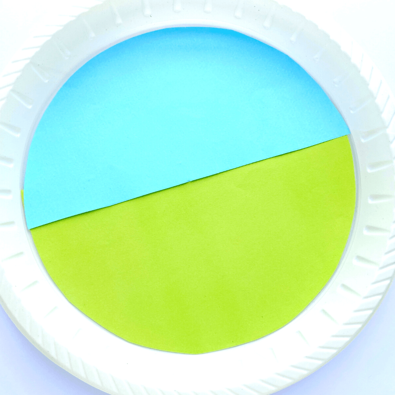 • Cut two half-circle pieces of craft paper to fit the inside of the paper plate. I choose green and blue for the grass and sky. If you’d like a night sky, use black paper instead of blue. Glue these to the interior of the plate.