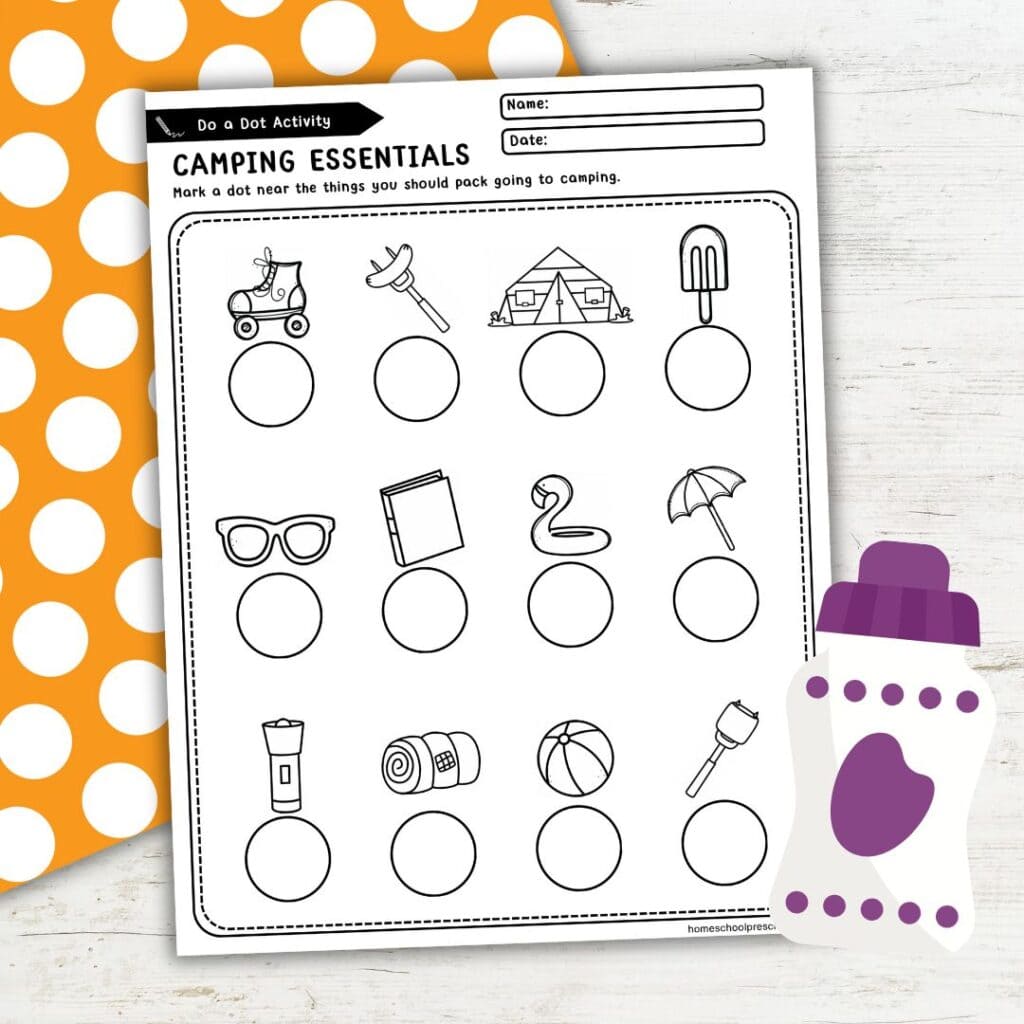 Whether you’re a homeschool parent or a teacher, these free preschool printables are easy to use and packed with hands-on learning. Kiddos will love using their dot markers to fill in cute camping pictures, follow the ABC trail, and spot items they’d pack for a real campout. It’s learning, creativity, and play all rolled into one simple activity—no prep needed!