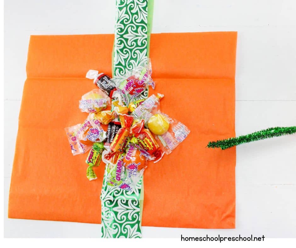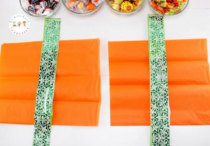 - Cut your orange tissue paper into squares. Each square should be large enough to hold a small handful of candy in the center (around 10×10 inches works well).