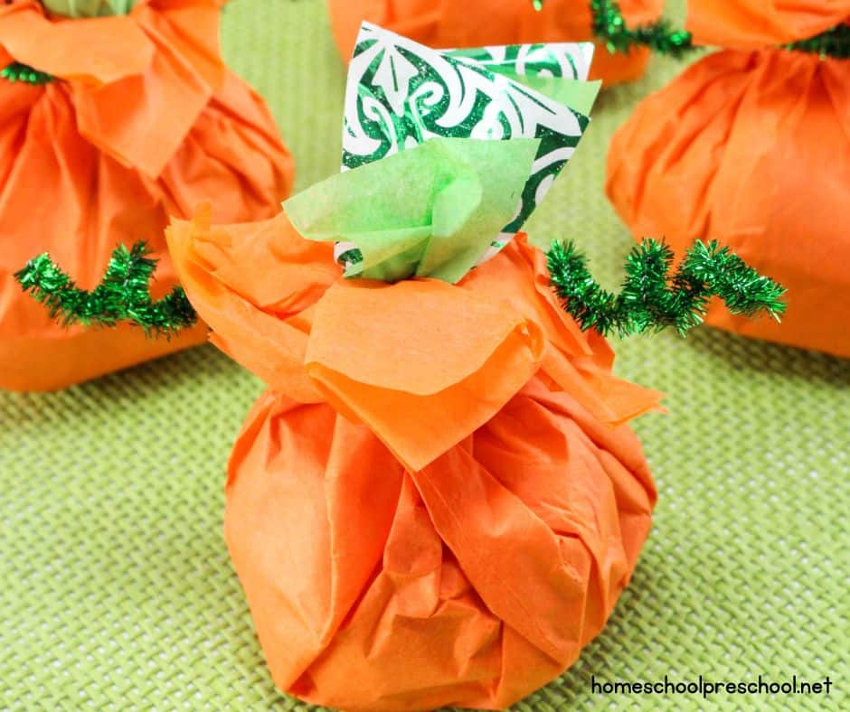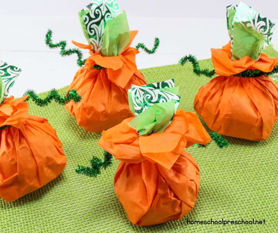 This candy-stuffed pumpkin craft is one of our favorite Halloween preschool activities — it’s cute, creative, and filled with treats! These little pumpkins are simple enough for preschoolers to make on their own and double as party favors, trick-or-treat gifts, or fall table decorations.