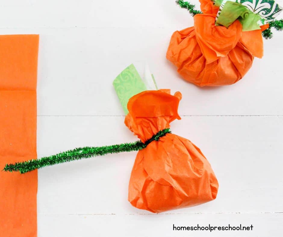 - Wrap a green pipe cleaner around the gathered tissue paper near the top to secure it. Twist the pipe cleaner tightly to hold the candy inside and create the pumpkin's "stem." You can leave some extra pipe cleaner at the top and curl it to resemble a vine.