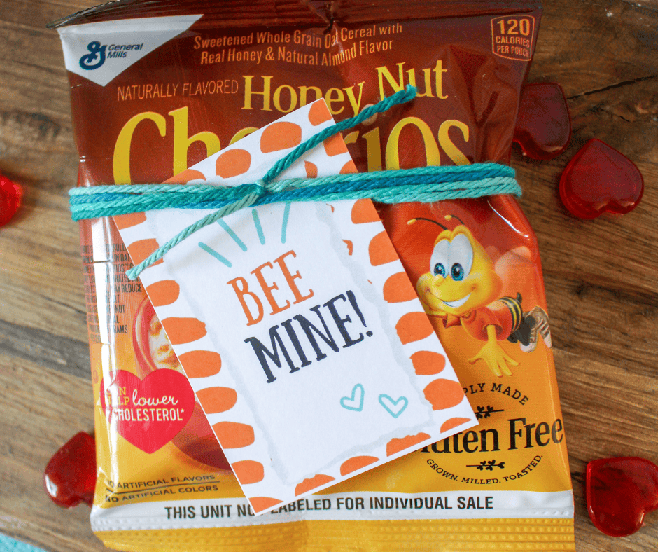 Once you’ve got all of your free printable cereal valentines printed out, use a hole punch to punch a hole in the top of each card. Use a piece of double-sided tape to adhere each card to a bag or box of cereal.