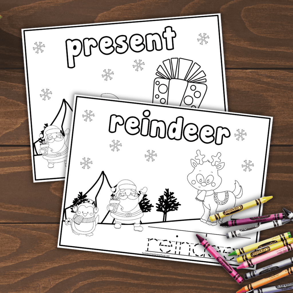 I love these Christmas coloring pages so much. I can’t pick just one favorite. What I love even more than their cuteness is the fact that you can sneak in a little learning with these pages.