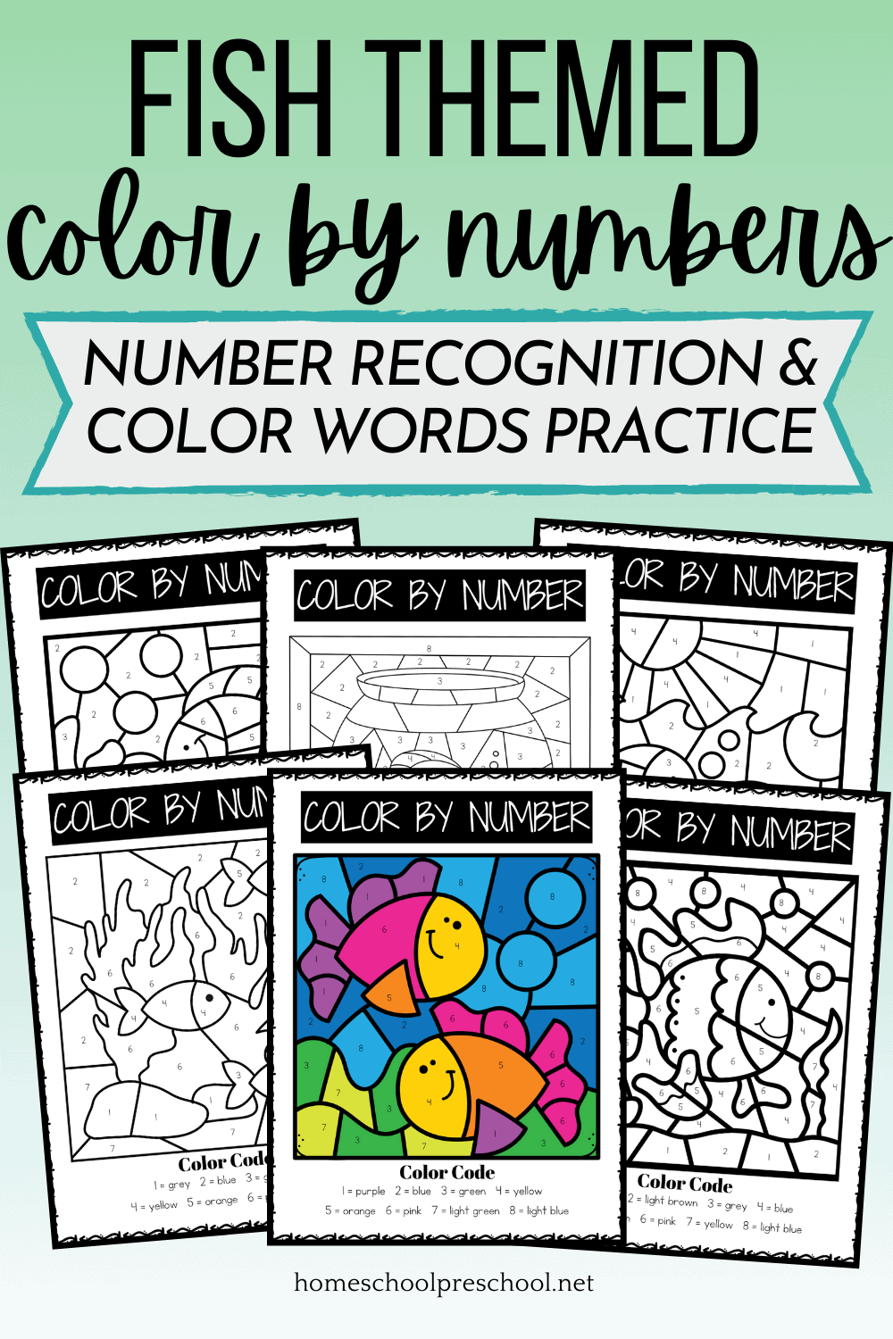 These fish-themed color by code printables are a fun way for preschoolers to practice number recognition through eight.