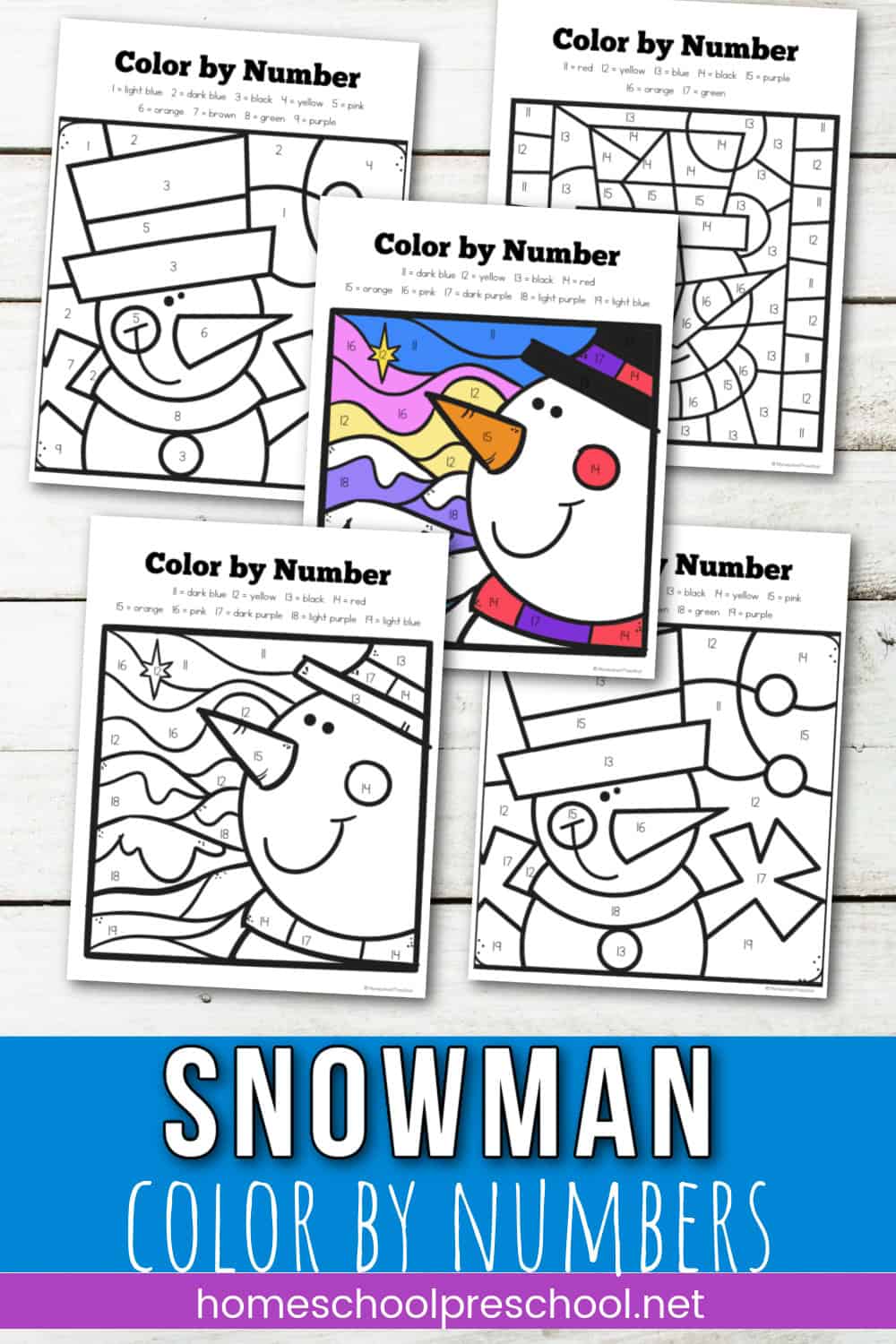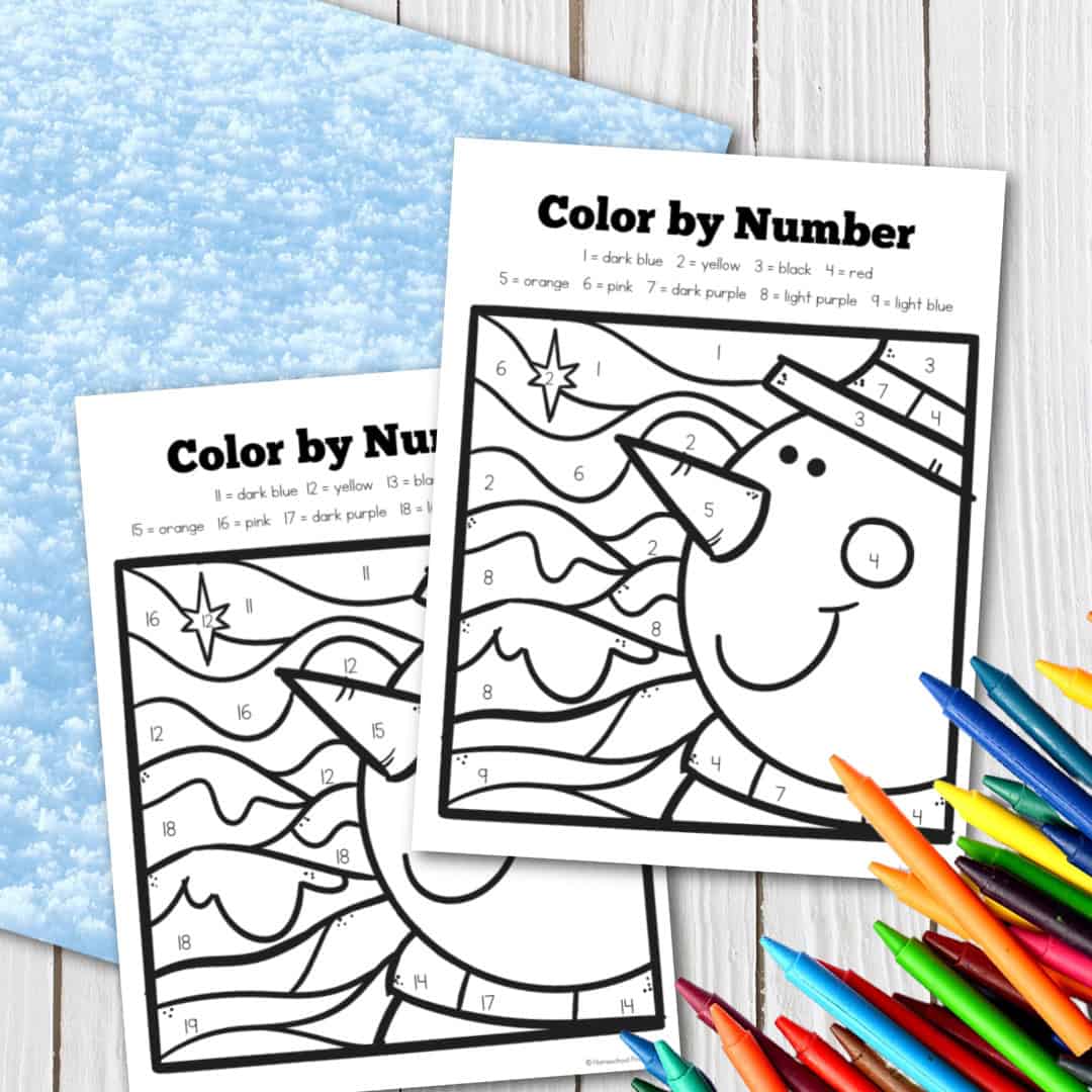 In this pack of winter printables, you’ll receive six color by number worksheets. Each page features a different snowman for your preschoolers to color, and they feature numbers 1-9 and 11-19.